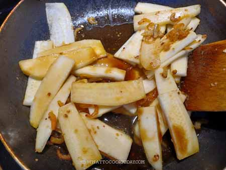 6. Cover and cook for about 2-3 minutes or until the gourd strips are soft but not mushy and there will still a bit of broth left so the dish is a bit saucy but not soupy. Have a taste and adjust seasonings to your preference