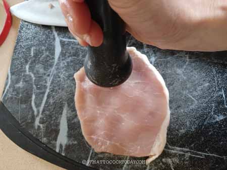 - Use a meat mallet to tenderize the pork chops. If you don't have one, you can use the back of a knife or a pestle (take care not to pound too much that you break the meat with the pestle)