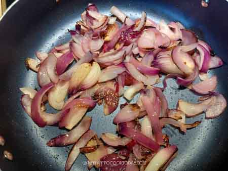 - There should still be some oil in the skillet, if not, add another one tablespoon. Add your onion wedges to the same oil. Reduce the heat to medium-low. We want to carmelize the onion. This may take 10-15 minutes