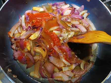 5. Add the sauce ingredients in and make sure to use your spatula to scrape the bits that stick to the bottom and side of the skillet. Those are good stuff that gives extra flavor. Increase the heat to medium-high to let the sauce comes to a simmer
