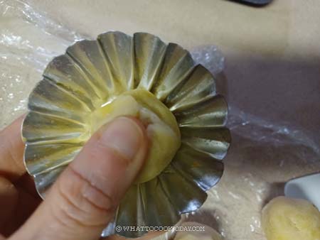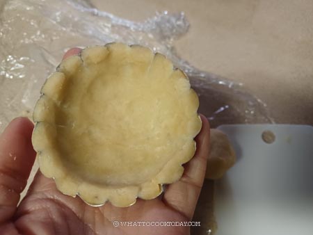 - Remove from the fridge and cut into 10 portions (about 20-22 grams each). Take one dough and give it a knead to soften it. Place the dough ball on the center of the mold and then use your thumb to press down in the middle and push outwards to mold into the tart mold. Repeat with the rest of the dough and tart molds. Use the tines of the fork and poke some holes at the bottom of the tart shells so they won't swell up during baking