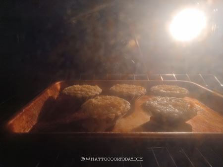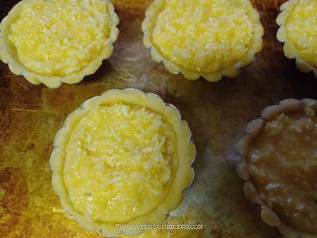 9. Preheat the oven to 425 F (220 C) for conventional oven, 400 F (200 C) for convection oven. Position the oven rack, 4th rack from the top. Remove the tart shells from the fridge and scoop the coconut mixture onto the tart shells. Portion out the filling evenly among the 10 tart shells