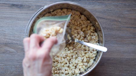 - While the beans are cooking, you can prepare two 1 quart-size zip lock bags or four 1/2 quart-size zip lock bags that are already poked with a toothpick on both sides (1-inch apart)