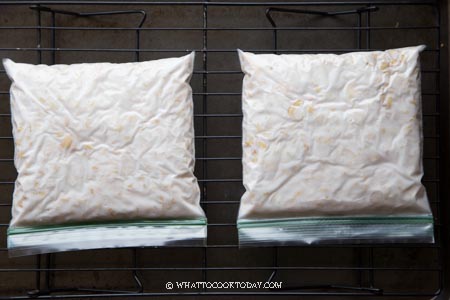 If you use Instant Pot to incubate: Put a trivet in the inner pot of Instant Pot. Gently put the bags on top of the trivet. Close the lid and press “Yogurt” button repeatedly until the light shows “less” mode and then set the timer to 14-24 hours. I set to 14 hours first to remind me to check on the beans and wipe off any condensation inside the lid & then continue to culture until about 48 hours