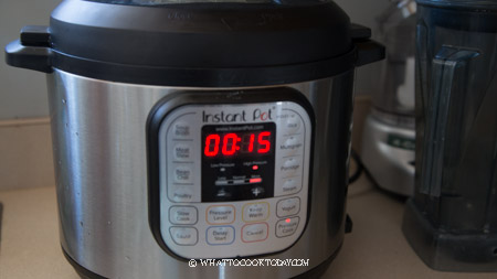 Close the lid and turn the steam release valve to “sealing”. Press “pressure cooker” and make sure it’s on “high pressure”. Set timer to 15 minutes and then wait 5 minutes before fully releasing the pressure