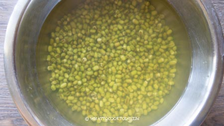 - Soak the dried green beans in clean water for 24 hours. After that drain off the soaking water. You will see tiny white tails on most of the beans. The dormant beans have now "awakened"