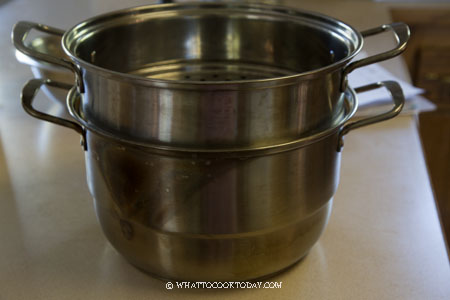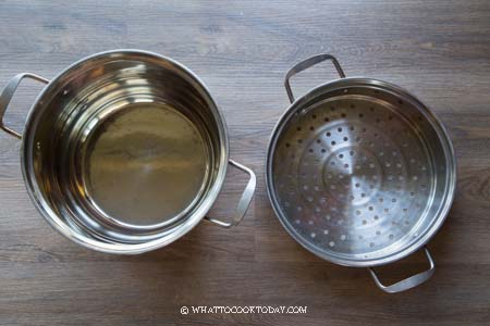 - Place the colander on top of a pot (to collect water). In my case, I use a steamer tray with its pot underneath it