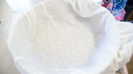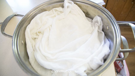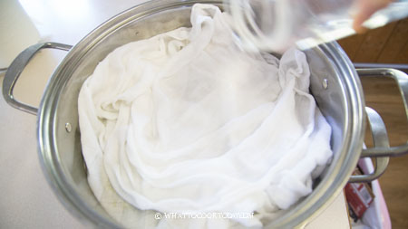 Wet the cheesecloth with some water and wring out any excess water. Place the cheesecloth over the colander