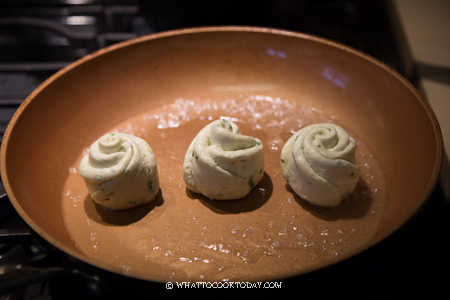 - Preheat a large non-stick pan that has a lid over medium heat. Add about 1 Tbsp cooking oil. Gently place the hua juan on the pan, about 1-inch apart. Cook over medium heat until the bottom is golden brown, about 2 minutes or so