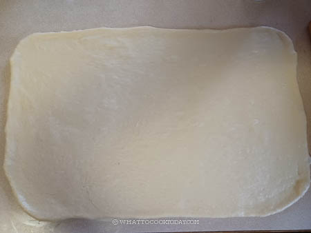 8. Transfer the dough to a lightly floured work surface. Knock out all the gas, round it up into a dough ball, cover with a cling wrap to prevent them from drying. Rest for 15 minutes to relax the gluten. Roll the dough out into a roughly 14 x 18-inch rectangle with the same thickness throughout if possible