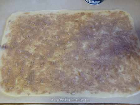 - Spread the filling evenly on the surface using an offset spatula. Fold the dough in half on the long side