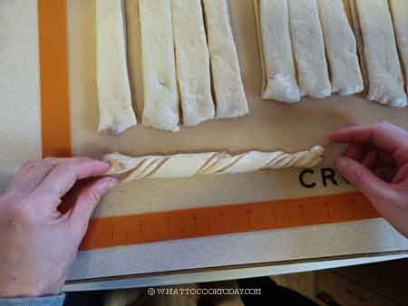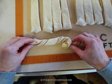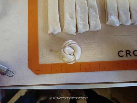 - Use a pizza cutter or a very sharp knife to cut into 10-12 strips. Take one strip and twist it several times and then coil it on the side and tuck the tail to the bottom.