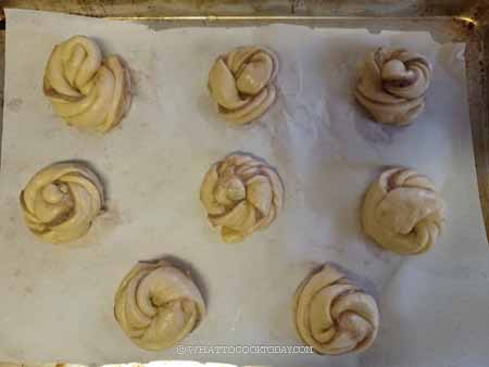 14. Arrange the shaped dough on a large baking sheet lined with a parchment paper. Allow about 2 inches between the dough