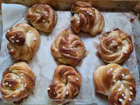 Kannelbullar is a Swedish cinnamon cardamom buns. The buttery sweet dough is scented with cardamom, which really kicks things up a notch for me. I’m a HUGE fan of cardamom. I love the warm, spicy and strong aroma of cardamom. If you are not a fan, you can certainly skip or reduce the amount. Kannelbullar has a beautiful twisted shape and dotted with Swedish pearl sugar on top. The buns are filled with buttery cinnamon sugar filling.