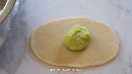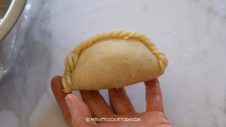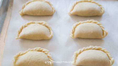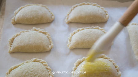- Preheat oven at 350 F (180 C). Work with one dough at a time, bring both ends together and then flattened into an oval again, about 6 inches in length and 4 inches in width. Put about 2 Tbsp of the kaya filling on the bottom half or top of the dough. Fold the dough over and pinch to seal the edge. You can pleat the pattern on the edge if you want. Put on a baking sheet lined with parchment paper, about 1 inch apart