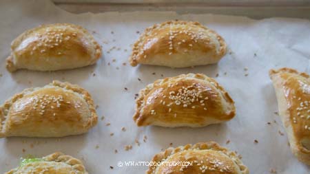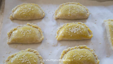 - Mix the egg with water to prepare the egg wash. Bake in the oven for 10 minutes and then brush with some egg wash and sprinkle sesame seeds on top and bake for another 20 minutes. Then I turned on the broiler on low (top heat) and let them broil until it is slightly darker golden brown, this only takes a minute or so. Do not walk away or you will burn the kaya puff