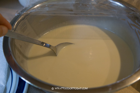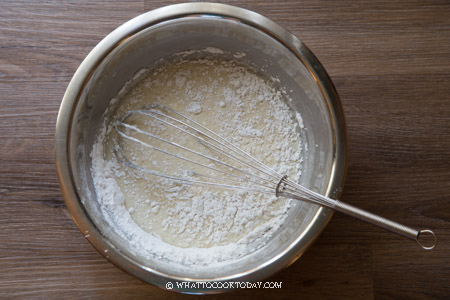 – Gradually add in the rice flour in 3 batches and continue to whisk until the batter has no lump and smooth. Strain the batter if you can’t get rid of the lumps. Cover and rest the batter for 15 minutes.