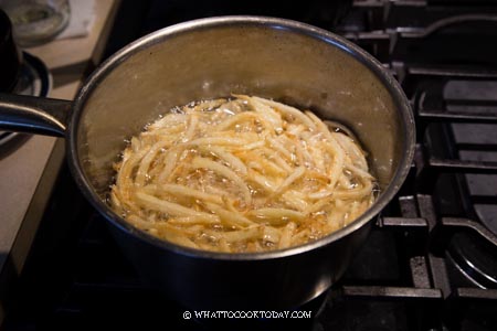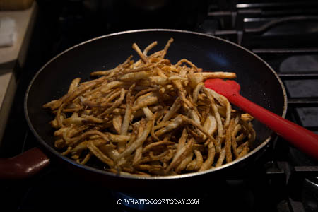 Preheat about 1 1/2-inches of cooking oil over high heat. When you dip a chopstick into an oil and it bubbles around the chopstick, the oil is ready. Or you can just put one piece of potato in there and if it bubbles and floats, the oil is ready. Lower the heat to medium. You need to fry the potatoes in 3-4 batches. DO NOT dump all at one go. Place the first batch in and fry until the potatoes are crispy and golden brown. Remove to an absorbent paper towel. Continue frying the next batch.