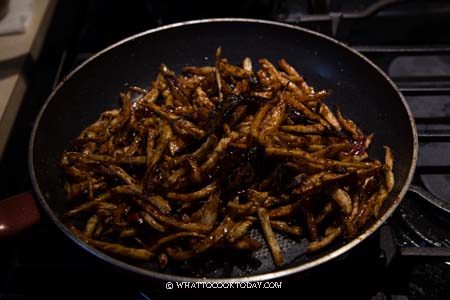 Kering kentang may get soggy a few minutes or hours after you make it. Many people will soak the potatoes in air kapur sirih (lime stone paste) to make sure the potatoes stay crispy longer. I do not want to do that and you don’t have to. This kering kentang stays crispy for one whole day actually. Here’s how: