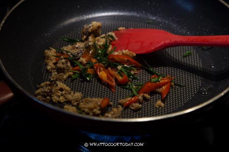 Preheat 1 Tbsp of cooking oil in a large pan/wok. Add the kaffir lime leaves and Thai chili and fry briefly, about 10 seconds or so.