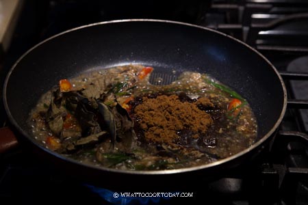 - Preheat oil in a large pan/wok. Add the kaffir lime leaves and fry briefly, about 10 seconds or so. Add the rest of the ingredients above and cook until the sauce thickens to a syrup consistency