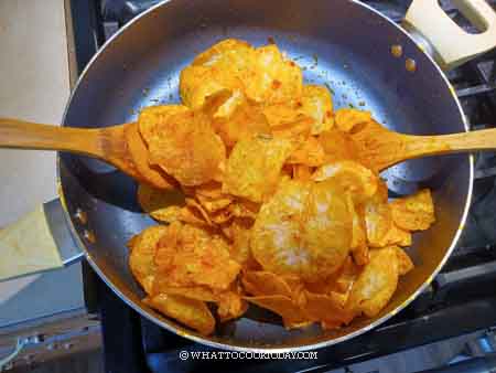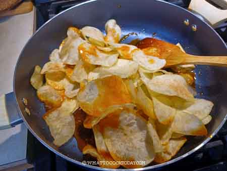 - Add the fried potatoes into the sauce and turn off the heat. Use two spatulas to gently toss the fried potato chips to make sure the sambal is coating the potato chips. Some pieces may be stuck together as the sugar caramelizes and that's normal. Transfer to a serving bowl. The keripik will crisp up as they cool down