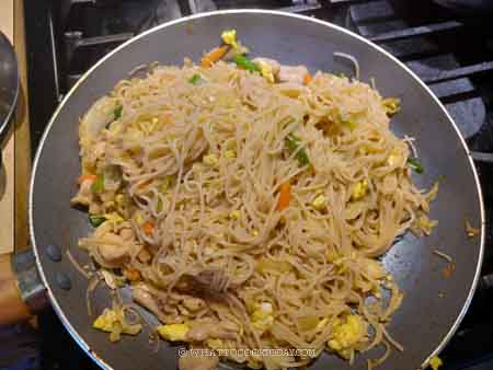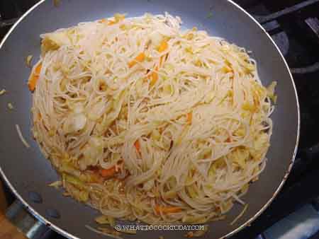 - Pour in the seasonings and use a tong or chopsticks to move things around again to make sure the noodles are mixed evenly with the seasonings. Let the noodles cooked and absorb the seasonings and liquid. The noodles should be soft but not mushy