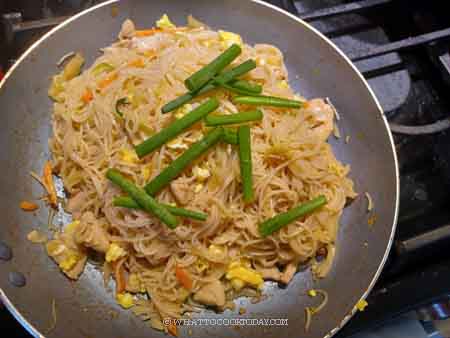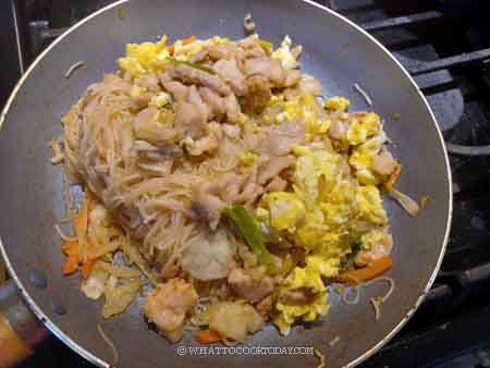 10. Add the pre-soak rice noodles. If you have a tong or a pair of chopsticks, it’s easier to move the noodles around with it, especially if you are a newbie with stir-frying noodles. It helps to mix things up and to loosen up the noodles a bit.