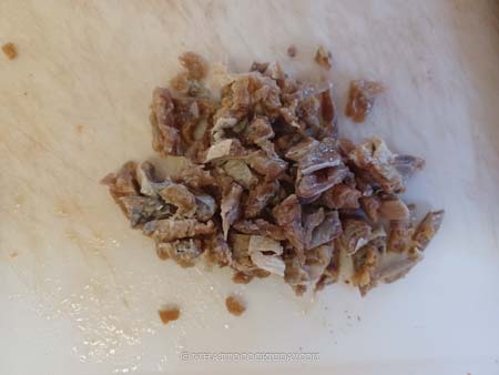 3. Remove salted fish from the oil. They come with bones too. Remove the bones and cut the meat part into small pieces. If you use the dried ones, soak them in warm water for at least 30 minutes to get rid of excess saltiness, then cut them into small pieces