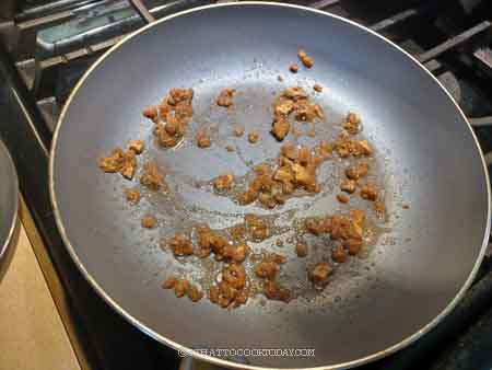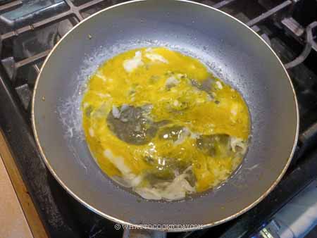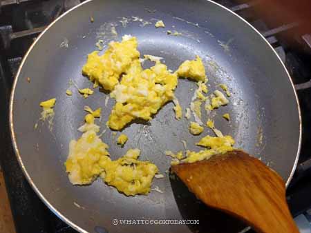 - You don't need to clean the pan/wok as we want all those good flavor left behind. Add another 1 Tbsp of oil and let it heat up a bit. Pour in the beaten eggs and stir for a few seconds and then let them cook undisturbed for about 10 seconds then start scrambling them into smaller pieces. Remove them from the pan/wok