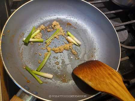 6. To the same oil, add the garlic and white part of the onion and stir fry for about one minute