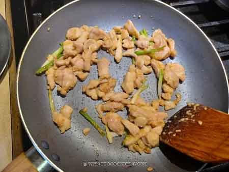 7. Add the meat and stir fry until they are cooked through, which shouldn’t take long, about a minute or two. Remove the meat from the pan/wok
