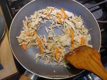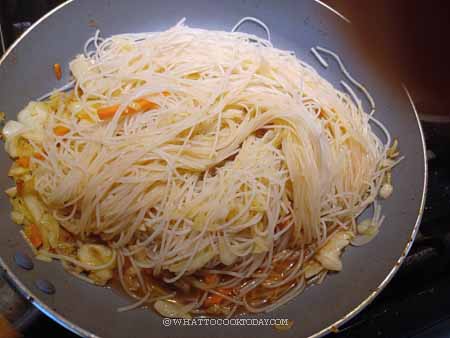 - Add another 2 Tbsp of oil and let it heat up a bit again. Add the cabbage mix and stir fry for about a minute. Add the pre-soak rice noodles. If you have a tong or a pair of chopsticks, it's easier to move the noodles around with it, especially if you are newbie with stir-frying noodles. It helps to mix things up and to loosen up the noodles a bit.
