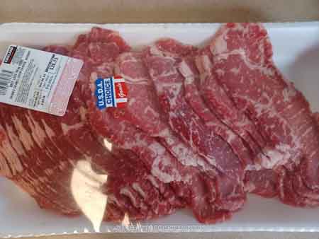 - I use a shabu shabu cut beef short loin from Costco, which is about 1/4-inch thick.