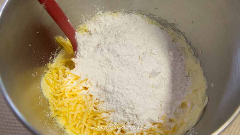 - Once the butter and egg are combined, add the flour, milk powder, cheese, and chicken powder (updated, previously I just use salt, but chicken powder add that nice "gurih/savory" taste). Use your hand to mix everything into a dough. It may seem really dry at first, but keep mixing and they will come together into a dough