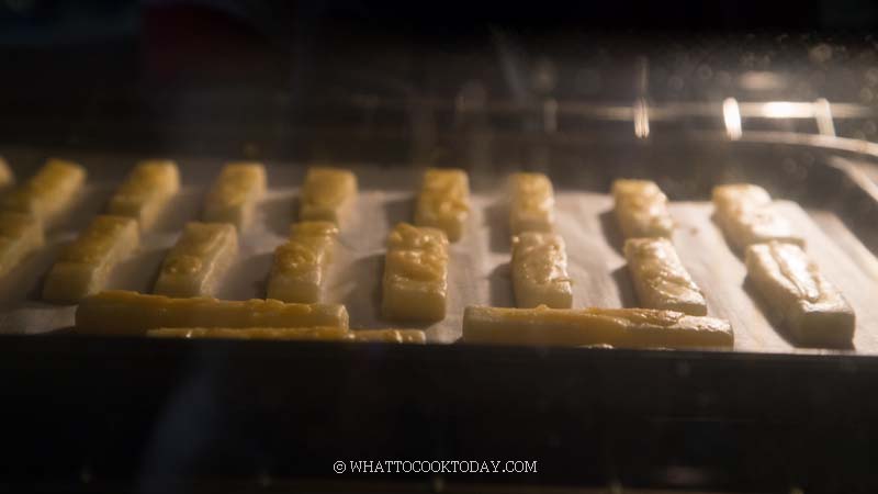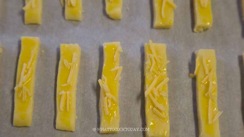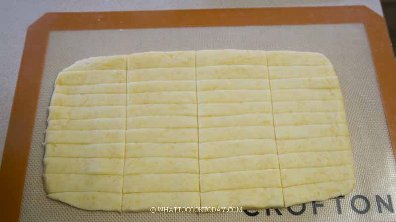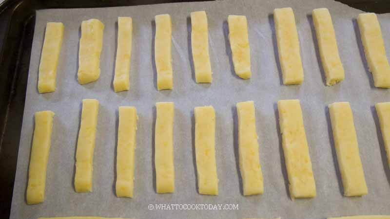 - Preheat oven to 300 F (150 C) for a conventional oven. For a convection oven, please lower the temperature by 20 degrees. Line baking sheet with parchment paper. Place a parchment paper or silicon mat on a working surface. Roll the dough out into a rectangle about 1/2-inch thickness. Use a knife or pizza cutter to cut the dough about 1/2-inch in width and then cut into individual about 2 inches long. You will probably get about 50-60 pieces