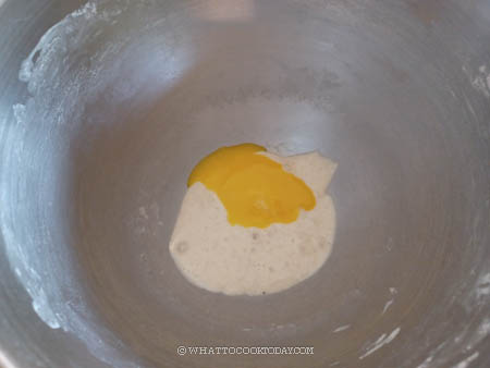6. Add the yolk and sourdough discard and use a whisk to loosen the mixture and whisk until combined. Depending on your sourdough discard, some can be quite thick and some may be runny and mixed easily