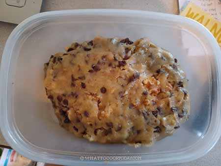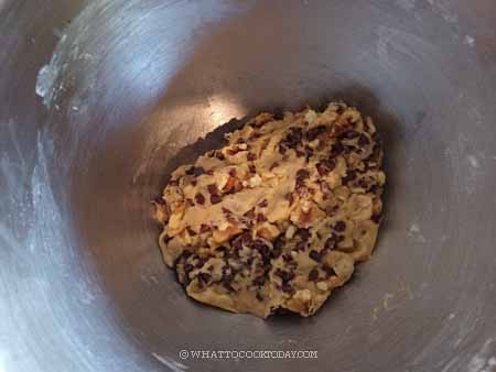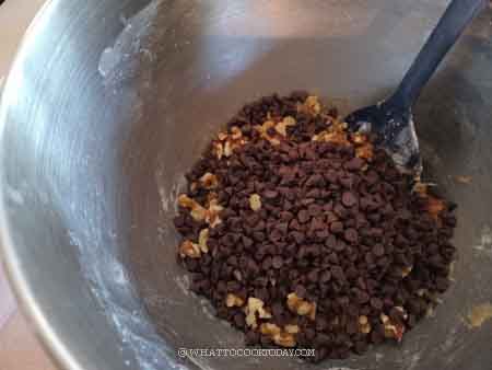 8. Fold in the chopped nuts and chocolate chip morsels and fold to combine just until you don’t see any more pockets of flour. Do not overmix. The dough is not an overly sticky type.