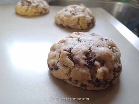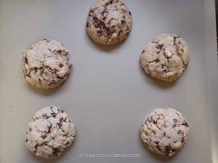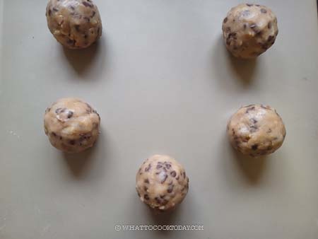 10. 10 minutes before you plan to bake the cookies, preheat the oven to 415 F (210 C) for conventional oven, 395 F (195 C) for convection oven. Position the oven rack in the middle. Line a large baking sheet with parchment paper. Get the cookie dough and divide into 5 equal portions, or you can weigh it. Each dough weigh roughly about 120 grams (4.2 oz). Round it up into a round tight ball so there won’t be any “holes” in the cookies later
