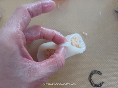 - Work with one dough at a time. Flatten the dough with your palm to about 1/3 inch (1 cm) thick circle. Put about 1 tablespoon of the peanut filling in the center of the dough. Gather the edge towards the center and pinch to seal the dough. Roll the dough ball in between your palms to smooth it into a nice round ball