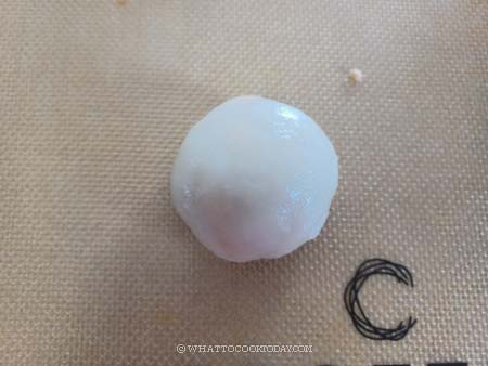 10. Put about 1 tablespoon of the peanut filling in the center of the dough. Gather the edge towards the center and pinch to seal the dough. Roll the dough ball in between your palms to smooth it into a nice round ball