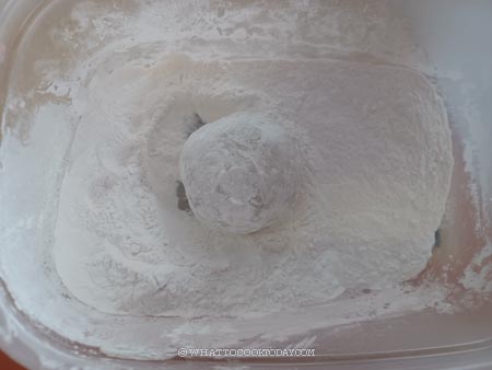 11. Roll the ball in the toasted rice flour you prepare earlier. Dust off any excess flour and put in a cupcake liner. Repeat this process with the rest of the dough and filling