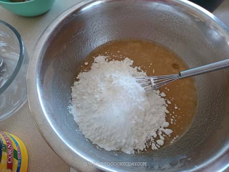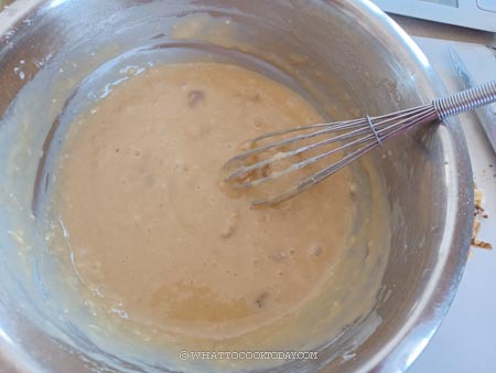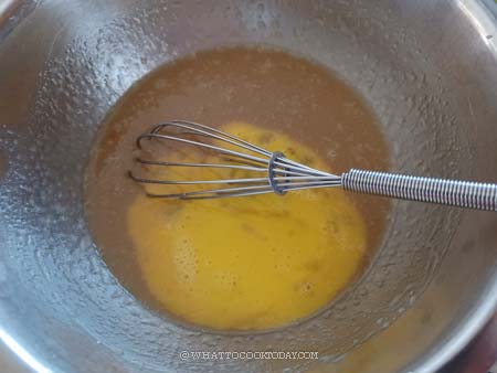 - Combine all the dry ingredients and set aside. In a mixing bowl, whisk the eggs and sugar until the sugar melts, add the melted butter, and vanilla and the milk you use to soak the dried longan. Whisk to combined