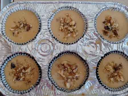 - Scoop the muffin batter into each cup, filling it about 3/4 full. Add the walnut pieces on top and sprinkle with some turbinado sugar