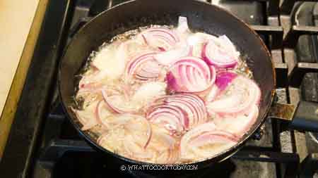 - Cut the purple onion or shallots into thin slices. Pour the oil into a small saucepan or skillet. Start with cold oil, add the onion/shallots and turn the heat to medium. When the oil starts to heat up, lower the heat to medium-low and let them fry slowly until golden brown. Don't crank up the heat too high because they get burnt easily. Remove the fried shallots from the oil. The oil can be used for cooking and it has nice aroma