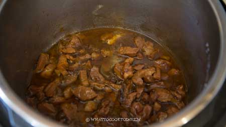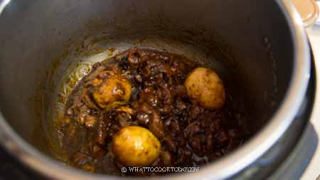 - Add 1 cup of water or enough just to cover the meat and hard-boiled eggs in. Bring to a boil and then lower the heat to let it gently simmer away. Cover with the lid, leaving slightly ajar. Let it gently braise for the next 1 hour or until the meat is tender. 30 minutes before the end of cooking time, add the hard-boioled eggs in and continue to simmer.