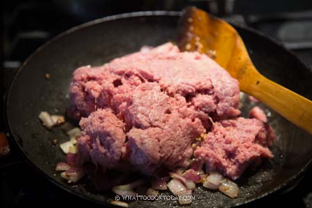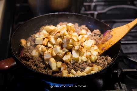 - Add bay leaves and ground meat. Use the spatula to break any lumps on the meat. Stir fry until the meat started to turn color and no longer pink. Add the seasonings and cumin powder and stir to mix everything. Cook for another 2 minutes or so. Have a taste and adjust to your preference. It should be savory with just a hint of molasses (from the dark brown sugar and Worcestershire or molasses if you use it). Turn off the heat and add the fried potato and stir to mix evenly