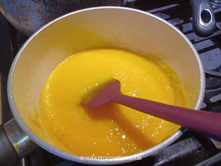 1. Peel and cut the mango flesh, avoiding the stringy part. Puree it into a smooth mixture. Transfer to a saucepan. Add sugar and lime juice.