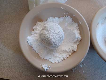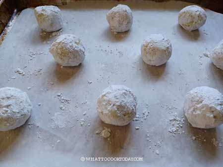 - Cover each one in granulated sugar first and then generously roll them in icing sugar. This step prevents the icing sugar from being absorbed by the dough and you won't get the crinkle effect. Roll them about 2-3 times in the icing sugar to make sure each ball is well-coated or the confectioners' sugar will not show much after baking