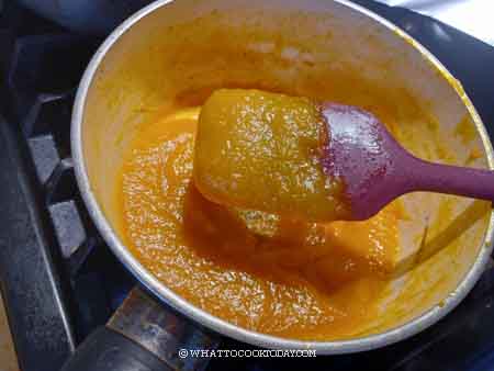 When I develop a recipe, I try to make it as simple as possible and remove any unnecessary steps if I can really get away with it and still get good result. I tried the recipe few times using fresh mango puree and the result is inconsistent because fresh mangoes, depending on the variety you use, have different moisture content. So, I decided to make a mango jam instead. By cooking the mango into jam consistency, most of the moisture is removed and the result is more consistent. So, with this recipe, I have to add extra steps to make the mango jam. If you can get store-bought mango jam, you can certainly use that. Please note that I didn’t use a whole lot of sugar to make the jam because I made it to be used in this recipe and I don’t want the cookie to be overly sweet in the end.